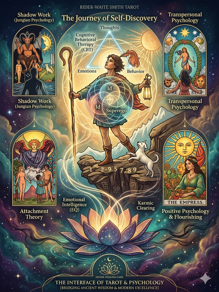 Psychological Bridge: Explore key concepts like Shadow Work (Jungian Psychology), Attachment Theory, Transpersonal Psychology, and CBT as they interact with Tarot spreads.